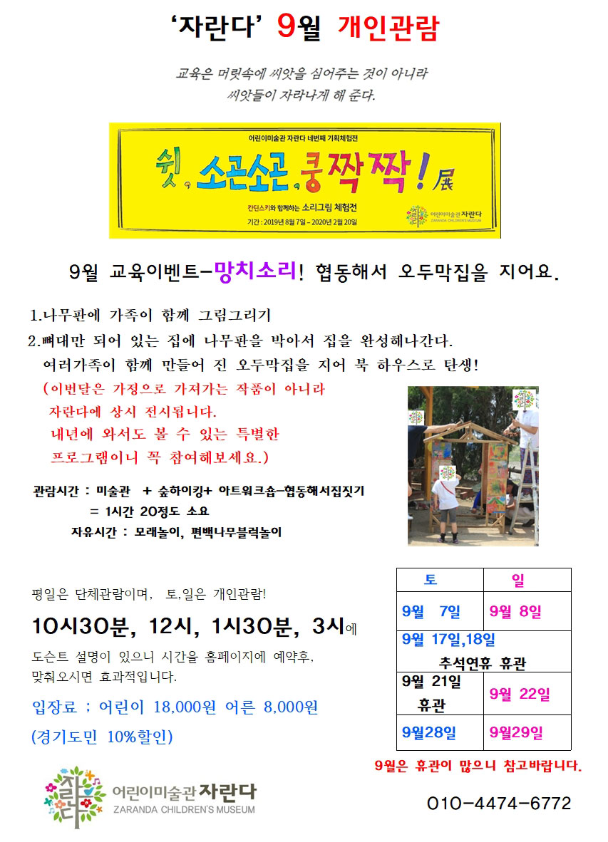 전시일정 | 9월 개인관람 안내 페이지 정보 작성자 자란다 작성일19-09-02 16:22 조회12,703회 댓글0건 관련링크 이전글 다음글 목록 본문 많은 관심 부탁드립니다. 댓글 등록된 댓글이 없습니다. 이전글 다음글 목록