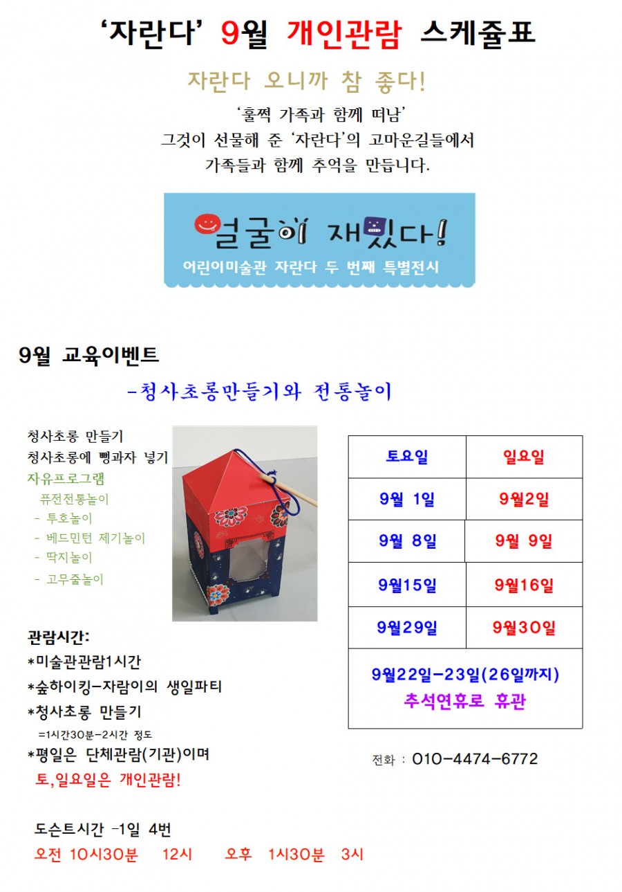 전시일정 | [9월 개인관람안내] 자란다 오니까 참 좋다! 페이지 정보 작성자 자란다 작성일18-08-23 18:22 조회13,821회 댓글0건 관련링크 이전글 다음글 목록 본문 많은 관심 부탁드립니다. 댓글 등록된 댓글이 없습니다. 이전글 다음글 목록