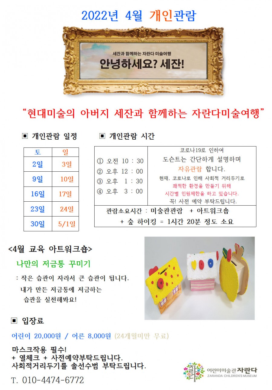 전시일정 | 2022년 4월 개인관람 안내 페이지 정보 작성자 자란다 작성일22-04-01 21:53 조회7,589회 댓글0건 관련링크 이전글 다음글 검색 목록 본문 많은 관심 부탁드립니다. 댓글 등록된 댓글이 없습니다. 이전글 다음글 검색 목록
